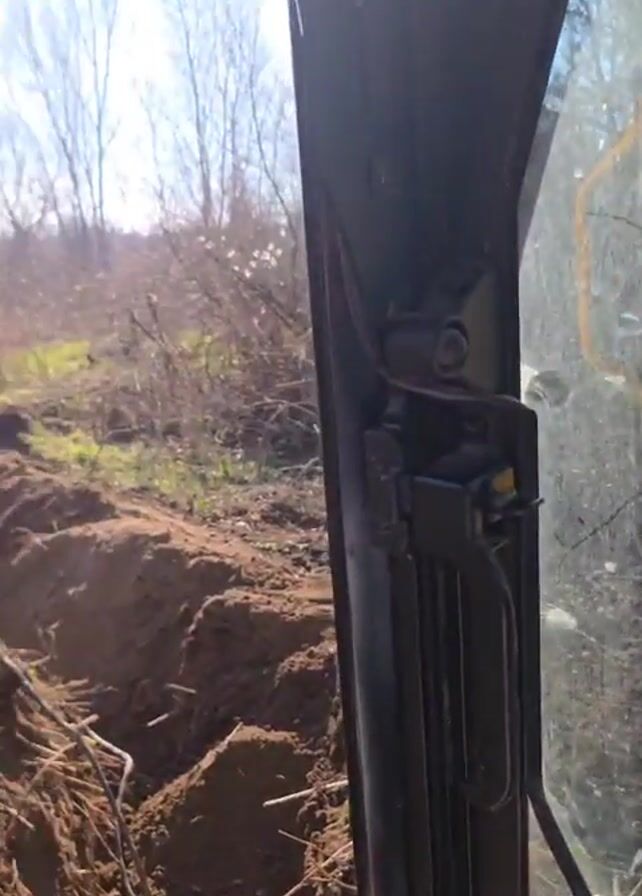 dug trench in a field from the perspective of inside a piece of heavy equipment