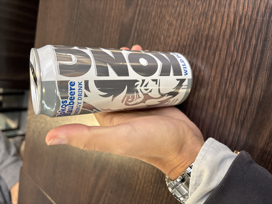 An adult's right hand, wearing a silver-toned metal wristwatch and a light-colored long-sleeved shirt cuff beneath a darker long-sleeved garment, holds an upright aluminum energy drink can. The can is primarily silver and white with dark grey accents, displaying the brand "KONG" in large stylized letters and "KOKOS BLAUBEERE ENERGY DRINK" (Coconut Blueberry Energy Drink) in blue text, with "WILD POWER" at the base. The can's pop-top is partially opened. The hand and can are positioned on a dark brown wooden or laminate table with a visible grain. The background is blurred, showing indistinct dark furniture or structures and a partial, out-of-focus figure wearing a grey long-sleeved top, consistent with an indoor public establishment such as a cafe or lounge. The precise location within Cologne, Germany, cannot be determined from the visible elements in the image.