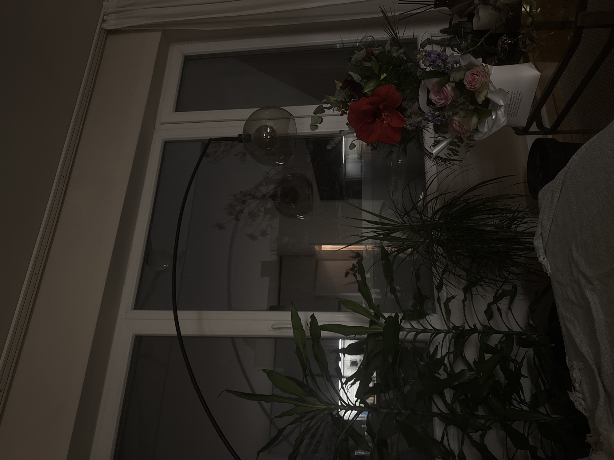 The scene depicts an interior setting in Sofia, Bulgaria, at nighttime, viewed towards a large, multi-pane window with white frames. The room is dimly lit, with external darkness visible through the glass, punctuated by distant artificial lights and reflections of the interior environment. A prominent black arched floor lamp, featuring two smoked glass globe shades with illuminated bulbs, is positioned in front of the window. To the left, several tall, dark-green houseplants with broad leaves occupy the foreground. On the right, a dark-framed side table holds two distinct floral arrangements: one with a large, vibrant red amaryllis surrounded by darker foliage and red berries, and another presented in a white paper wrap containing multiple light pink roses and smaller purple flowers. Additional decorative items, including what appear to be reed diffusers and small potted plants, are also on the table. In the lower left foreground, a light-colored, patterned textile, possibly a blanket or throw, is draped over an unseen surface, partially obscuring a dark potted plant. Light-colored curtains are visible on the right side, adjacent to the window frame. No individuals are present in the image.