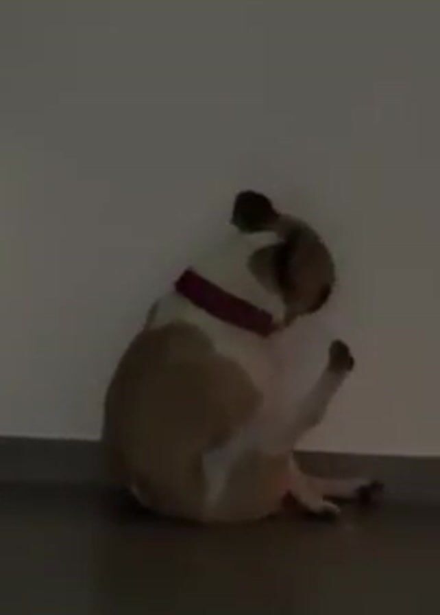 A medium shot shows a dog sitting on the floor, up against a wall, scratching itself