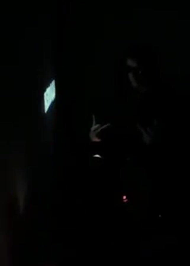 A dark room shows two people, one in the foreground and one in the background. The person in the background is wearing dark clothing, sunglasses, and holding up two fingers on each hand. A projector displays images on a wall to the left of the screen. The person in the foreground is facing away from the camera and looking at a small screen. The room is dark and difficult to make out details.