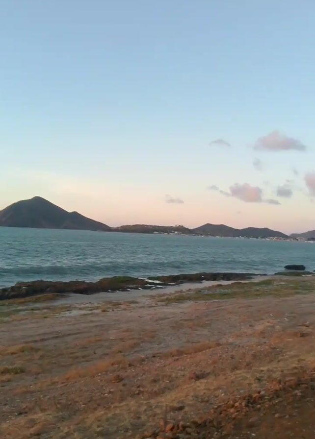 The video presents a coastal landscape featuring a body of water with several landmasses visible in the distance. A small, conical island dominates the center-left of the frame. The water is a pale blue-green and appears choppy. In the foreground, a sandy area transitions into a rocky shoreline where waves crash against the rocks. The sky is a gradient of pale blue fading into a hint of pink near the horizon. The video is filmed from a stationary position.