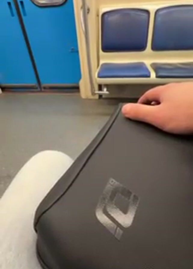 From the perspective of a seated passenger, the video depicts the interior of a moving subway car. The passenger is wearing light-colored pants and is holding a black bag with a logo on their lap. The subway car has blue and white seats, a gray floor, and blue doors. The train is in motion.