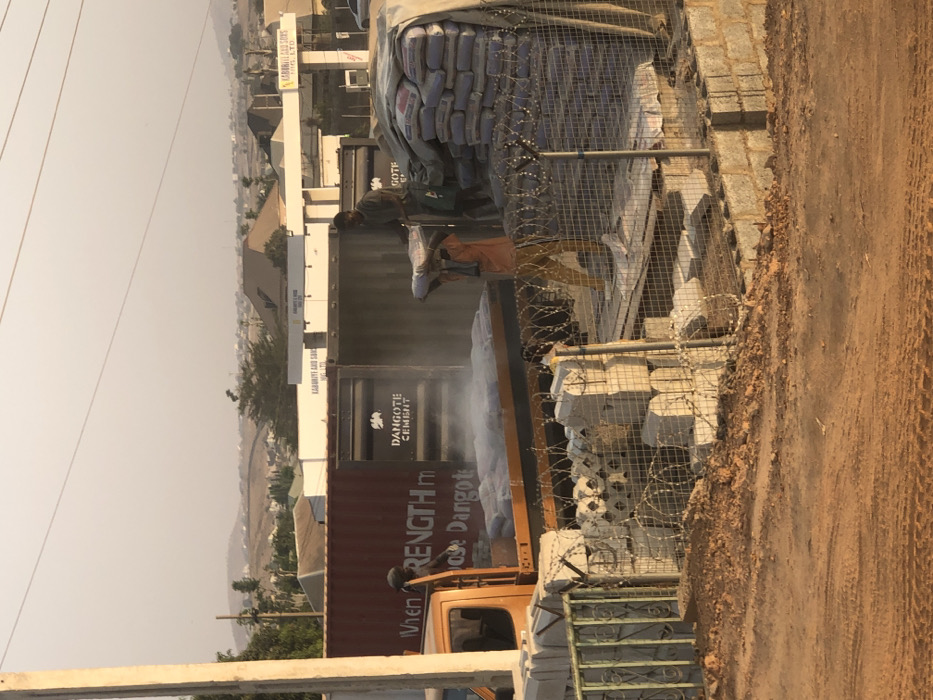 A truck labeled "Dangote Cement" is being unloaded