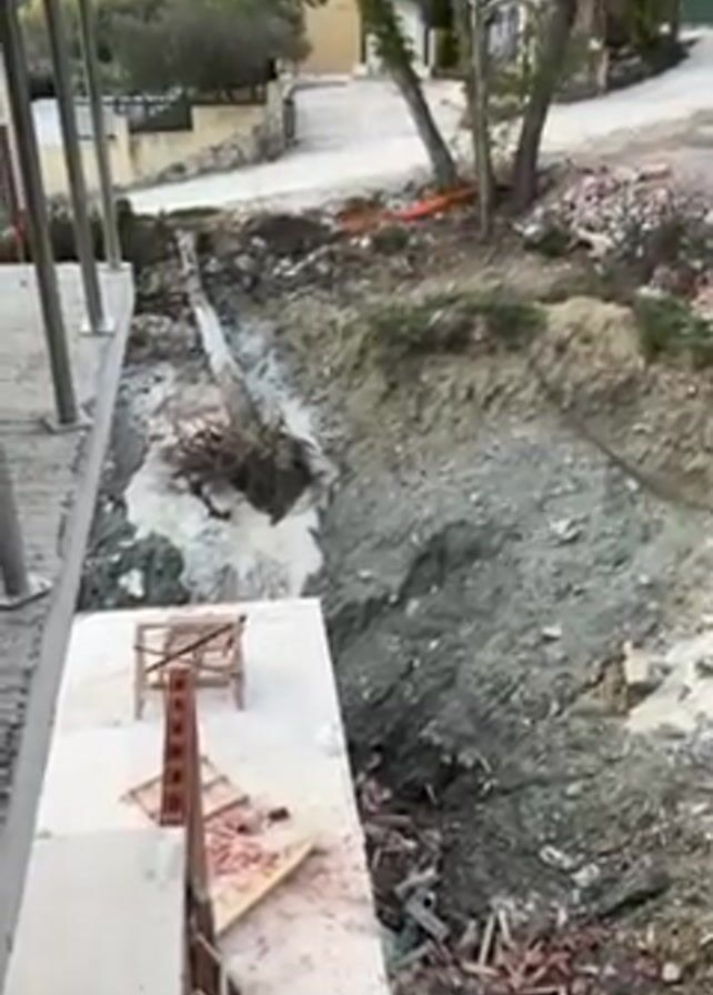 The camera looks down from an unfinished building's edge to a dirt slope and rubble-filled area. Metal support beams stand along the building's edge. Below, a trench is dug out, revealing gray earth. Debris, including wood and red brick fragments, litters the area. In the distance, a residential street is visible with houses and trees. The sky is overcast.