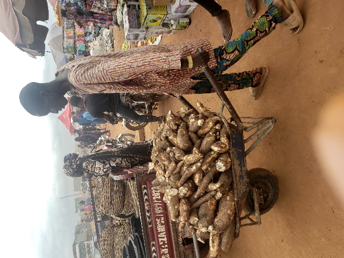 The scene depicts a bustling outdoor market or street in Adonkolo, Nigeria, under an overcast sky. The ground is unpaved reddish-brown dirt. In the right foreground, a dark-skinned male walks towards the left, pushing a blue metal wheelbarrow heavily laden with numerous unpeeled yams or cassava tubers. He wears a long-sleeved collared shirt with vertical red, white, and brown stripes, patterned trousers featuring blue, green, and black motifs, and a gold bracelet on his left wrist. To his immediate right, partial bare feet and feet in light-colored sandals are visible. In the midground, a red pickup truck bed is partially visible on the left, containing large woven baskets and dark circular objects. The text "ZA MPS / 097 / 2872" is partially legible on the truck's side. A woman wearing a patterned headwrap and dress stands near this truck, facing left. Behind her, a man sits on a black motorcycle, facing right. The background features numerous other individuals, multiple motorcycles, and large trucks, indicative of a busy public space. Market stalls are present, including one on the far right with a striped umbrella displaying packaged goods and boxes, and a red canopy tent in the mid-background.