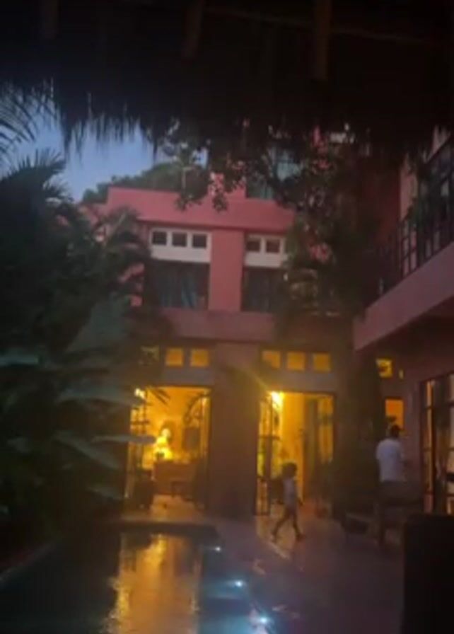 courtyard scene at dusk or dawn. In the foreground, a thatched roof partially obscures the view. A small, dark pool of water reflects the lights from the building behind. Tropical plants are visible to the left of the pool. The main building is painted a muted pink color, with multiple levels and windows. Two open doorways are visible on the ground floor, revealing a warmly lit interior with furniture. A child walks across the illuminated area in front of the doorways, heading right. A person wearing a white shirt stands in the right corner, looking away from the camera.