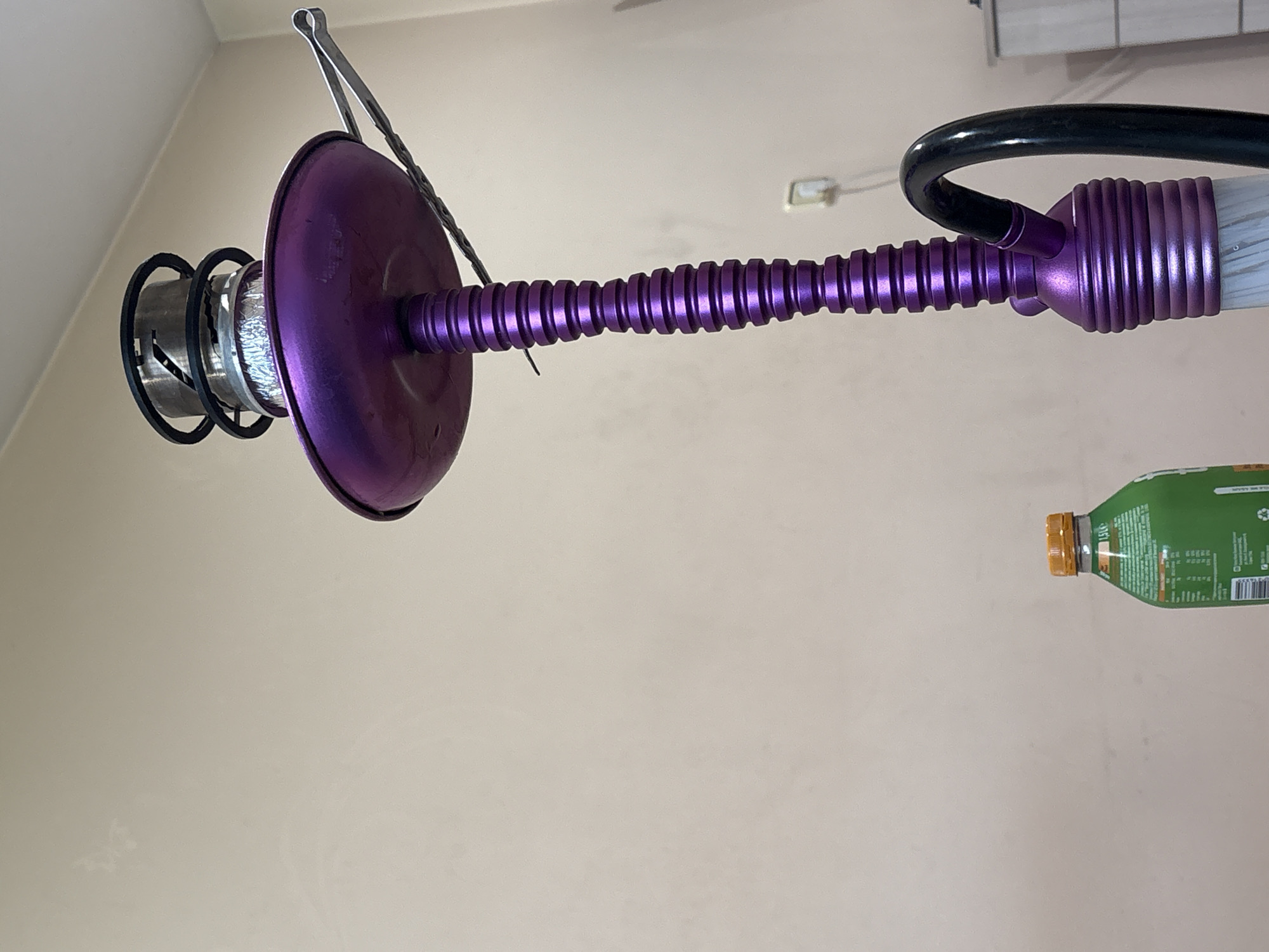 purple hookah with a black hose hanging against a beige wall. To the right of the hookah is a green juice bottle. The location is not discernible from the image.
