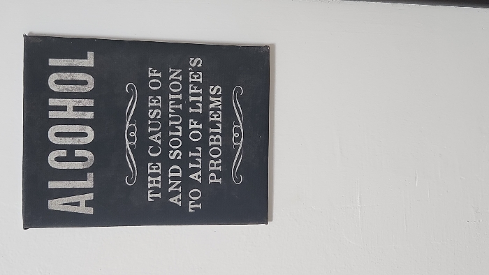 A black sign with white writing rests against a white wall. "ALCOHOL" is printed in large block letters on the left side. To the right, decorative swirls frame the saying "THE CAUSE OF AND SOLUTION TO ALL OF LIFE'S PROBLEMS." The lettering has a slightly distressed or vintage look.