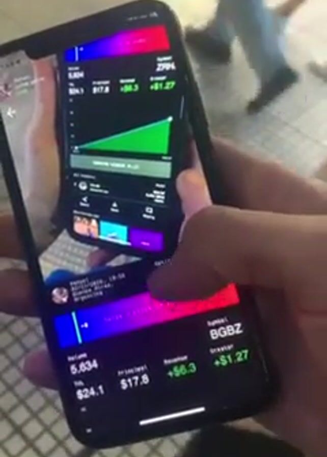 A person holds a smartphone displaying a graph with green lines indicating an upward trend, showing financial gains. The screen displays information such as "Volume: 5,634", "Principal: $17.8", "Revenue: +$6.3", and "+$1.27". The user interacts with the phone's screen by tapping on the graph and scrolling through the displayed data. The background shows people walking on a city sidewalk.