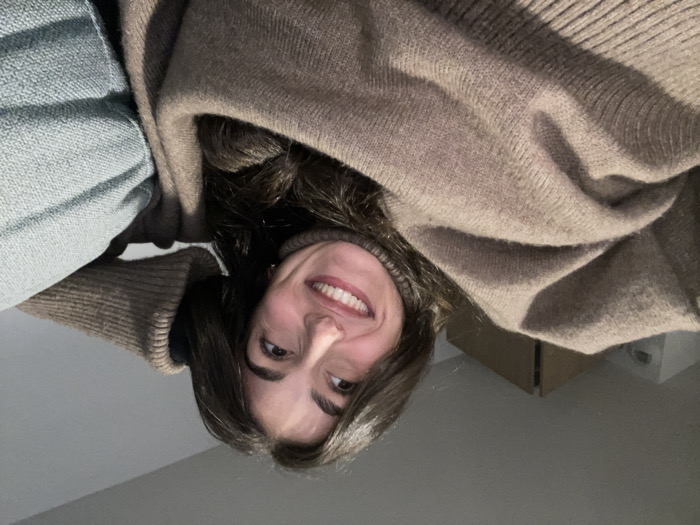 A woman smiles toward the camera, wearing a beige turtleneck sweater. Her brown hair is styled loosely around her face. Part of her light-blue pants leg is visible in the upper left. The background features a gray wall and part of a cardboard box is visible in the upper-right corner. The image is rotated counter-clockwise.