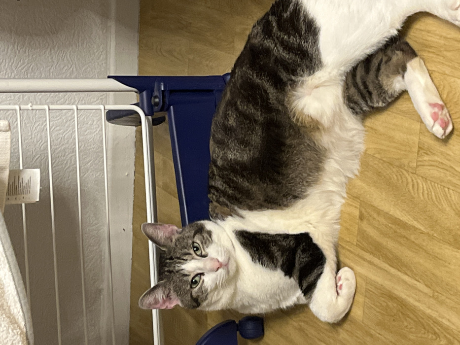 - "A cat with gray tabby markings on its back and sides and white fur on its underside lies on a wooden floor" by FM-o1TYQ2, licensed under CC BY 4.0