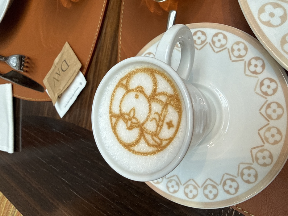 A close-up image depicts a white ceramic coffee cup and saucer, positioned on a brown leather placemat atop a dark wooden table. The cup holds a beverage topped with white foam, featuring intricate latte art of a stylized character resembling a duck or bird, formed from a golden-brown, possibly glittery, pigment. This character is centered within circular and quatrefoil patterns. The white saucer is adorned with a repeating light brown Louis Vuitton monogram pattern along its rim. To the upper right, a silver knife and fork are partially visible on the placemat, alongside a brown sugar packet marked 'DAV' (inverted) and a partially obscured white sugar packet. The scene is identified as the LV Café by Davide Oldani, located in Milan, Italy.
