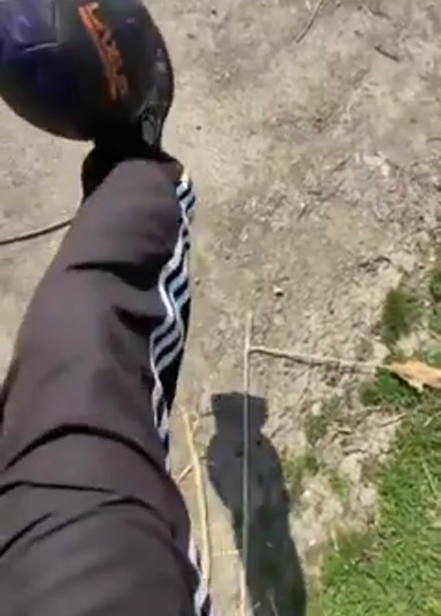 A person wearing black athletic pants with white stripes and athletic shoes is bouncing a dark-colored soccer ball with blue, green, and orange details. The person is standing on dirt near some grass. The ball bounces up and down against their leg and foot. The area is partially shaded.