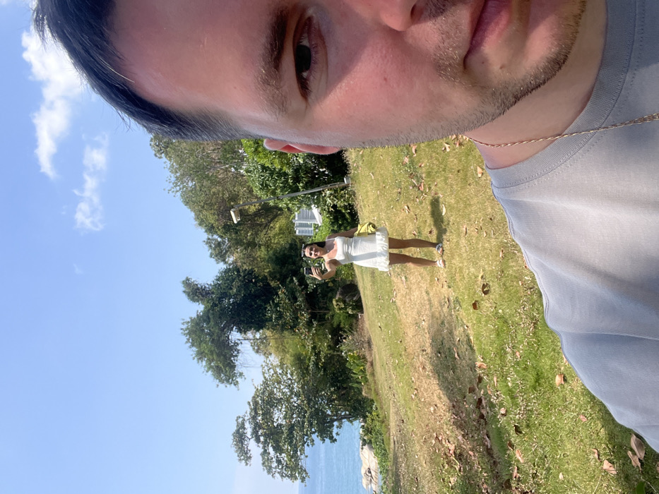 An angled close-up shot of a man with dark hair, beard, and a gold chain. In the background, a woman in a white dress holds up a phone, possibly taking a picture. The scene is outdoors with a grassy area, trees, and a glimpse of the ocean. The sky is blue with a few clouds. The man's face dominates the upper portion of the frame, while the woman and the landscape are in the distance.