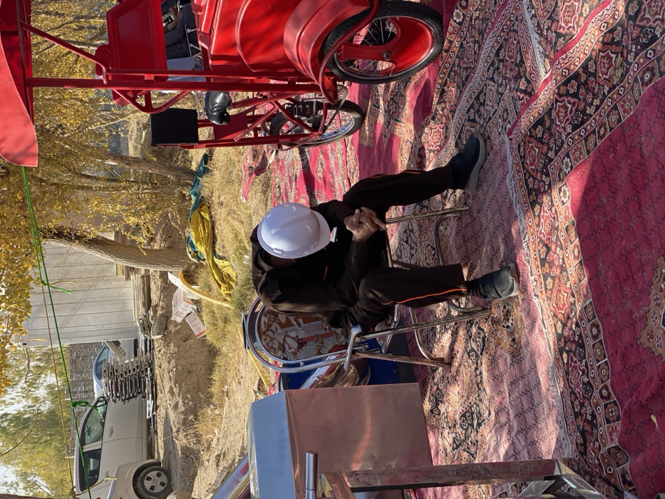 In Sard-E 'olya, Afghanistan, an outdoor scene unfolds under bright daylight, revealing a dry, dusty environment with scattered autumn-colored foliage. The ground is partially covered by multiple traditional patterned rugs, predominantly red and pink, suggesting a temporary setup. In the midground, an adult individual, dressed in a dark brown uniform or tracksuit with orange stripes and dark sneakers, sits on a chrome chair with patterned upholstery. A white hard hat rests on their head, obscuring their face as they lean forward, head bowed, with hands clasped in front. To the left of the person is a large, reflective metallic object, possibly a piece of catering equipment. To their right, part of a bright red three-wheeled vehicle, resembling a pedal-powered cart with a canopy, is visible. The background shows an area of dry earth with sparse vegetation, including deciduous trees with yellow leaves. Further back, a white sedan is parked, and a stack of metal chairs or tables lies on the ground. A section of a light-colored building or wall is also present. Green rope is strung across the upper left of the frame, and various debris, including cardboard boxes and a yellow-green tarp, are visible on the ground. No direct interactions between individuals are depicted.