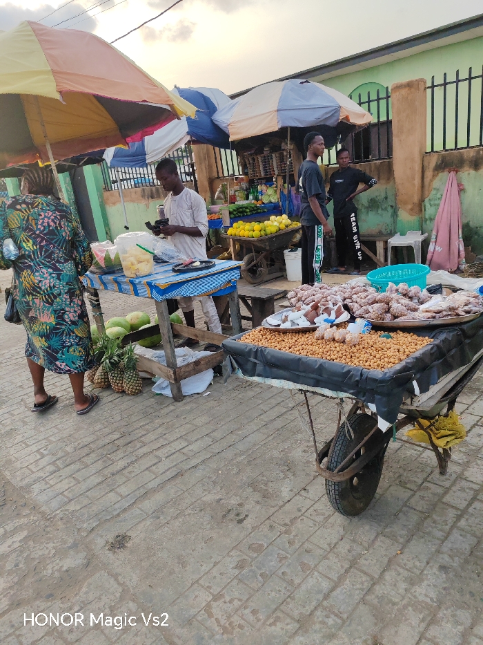 This image captures a vibrant street market scene in Lagos, Nigeria, at what appears to be late afternoon or early evening