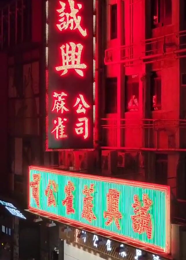 street scene at night in what appears to be Hong Kong. Two large, brightly lit neon signs in Chinese characters are prominently displayed on the side of a building. The upper sign is vertical and has red characters, while the lower sign is horizontal with green and red neon lights. The building is a multi-story structure. It is bathed in red light. The street below the building features parked vehicles. A man walks along the sidewalk, crossing the street.