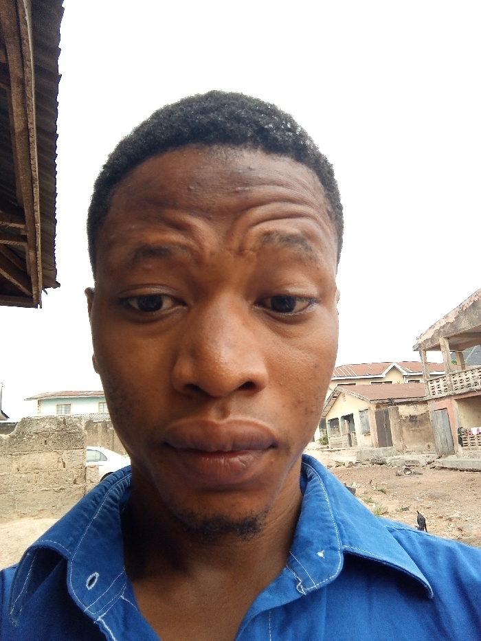 A close-up selfie of a man with dark skin, a low haircut, and wearing a blue collared shirt