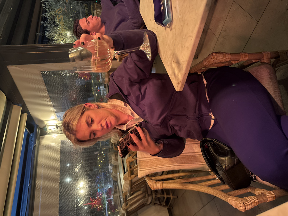 Two people sit at an outdoor cafe. The blonde woman on the left holds a phone in her hand and a wine glass in the other. She wears a purple jacket. Behind her, through a window, festive lights illuminate the outside. The man at the table lies horizontally with his eyes closed, also dressed in purple. On the table is a marble top, a cloth napkin, and a cylindrical object. Under the table, a black purse is placed on the woven chair.