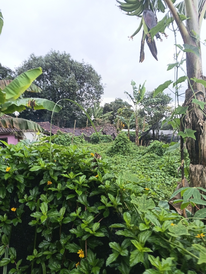 This image depicts a dense, overgrown natural environment in Baglung, Nepal, under an overcast sky. The foreground features a thick layer of vibrant green foliage, interspersed with small yellow flowers, covering the lower left and center. A textured, brown tree trunk, possibly from a banana tree, occupies the far right foreground, with green leaves and vines extending upwards. In the midground, a substantial area is covered by dense, interwoven green vegetation, appearing as an unkempt field or garden. A small, light brown animal, possibly a dog or goat, is partially visible within this vegetation in the middle-left, facing right. Several banana trees with large green leaves are distributed across the midground, with one prominent banana tree in the upper right bearing a cluster of green bananas and a hanging, purple banana flower (male bud). The background reveals parts of multiple low-rise buildings with reddish-brown tiled roofs situated behind the vegetation on the left. One building exhibits a distinct pink-painted wall section. Beyond these structures, a dense treeline of large, dark green trees forms the horizon against a light gray, uniformly cloudy sky. No human figures are present.