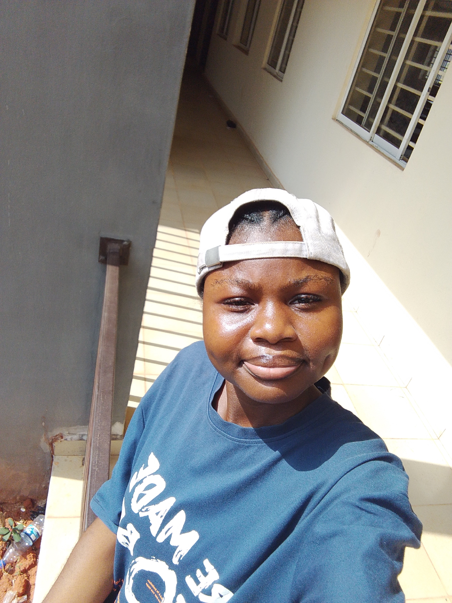 A young, dark-skinned woman with a dimple is posing for a selfie. She is wearing a gray baseball cap and a blue t-shirt with white text. She appears to be standing on a tiled landing outside of a multi-story building. The building has gray walls on the left side of the image and tan walls on the right, with white-framed windows. Sun shines brightly across the tiling and the building's walls. The location is likely Nsukka, Nigeria, given the prompt's indication. Debris, including a plastic bottle, can be seen on the ground on the left. The railings are made of brown wood.