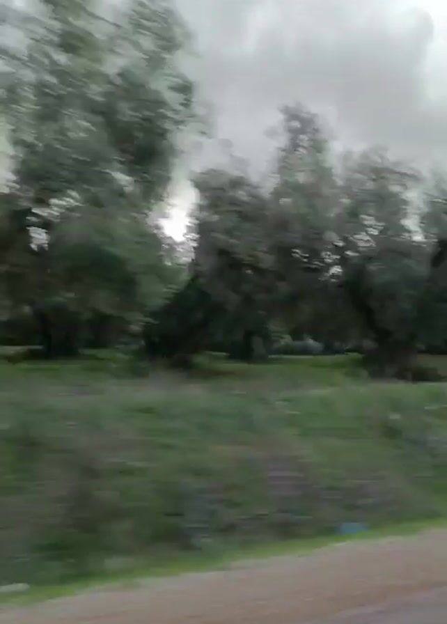 view from inside a moving vehicle. The scenery outside consists of a field of green grass and several olive trees. The trees are being blown by the wind. The sky is overcast and gray. A paved road is visible in the foreground.