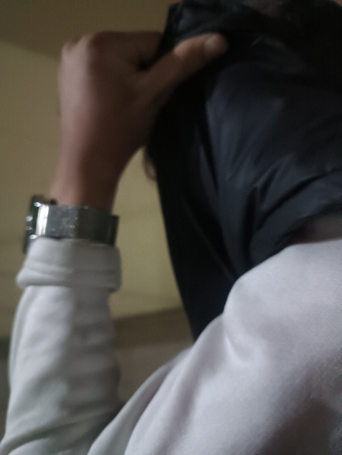 A person's arm and hand are visible. The person wears a wristwatch on their left wrist. The arm is clothed in a light gray or white long-sleeved shirt or sweatshirt. A hand is holding a dark or black piece of cloth. The material of the cloth appears smooth, possibly synthetic, and draped over the person's head. A small portion of skin is visible on the person's finger.