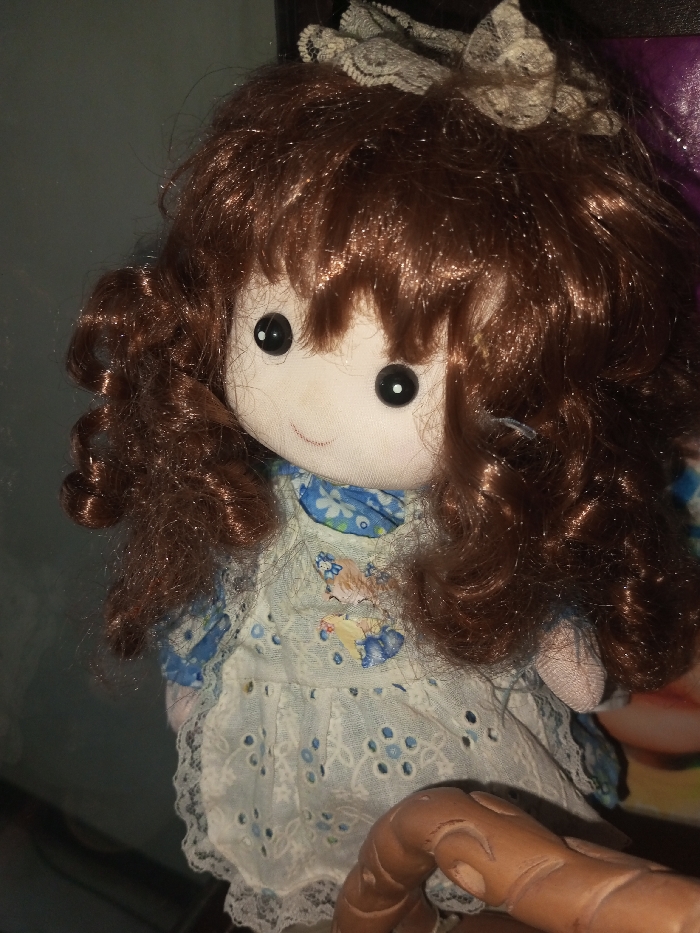A vintage doll with brown, curly hair, big black eyes, and a gentle smile sits center frame. The doll wears a light blue dress with white lace trim and a blue and white floral pattern on the bodice. A small, lace bow adorns the top of its head. A brown, possibly ceramic, hand reaches up and appears to be holding the doll. The background is blurred, suggesting a close-up shot in a dim setting.