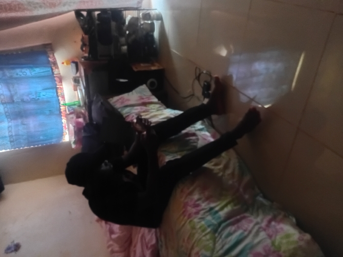 An individual is depicted seated on the edge of a bed within an indoor room in Karingani ward, Kenya