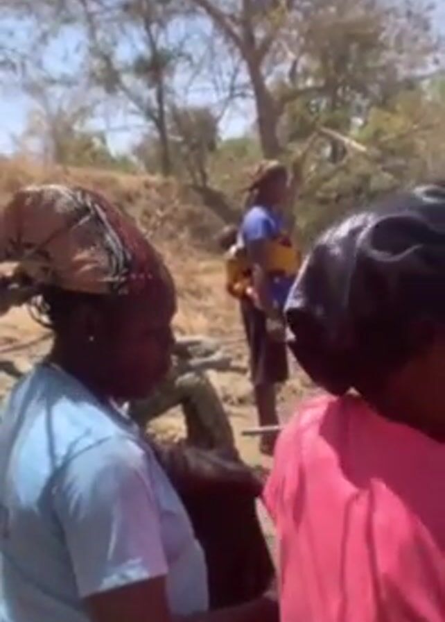The video depicts a group of people gathered around a well or deep hole in the ground, possibly working to extract water