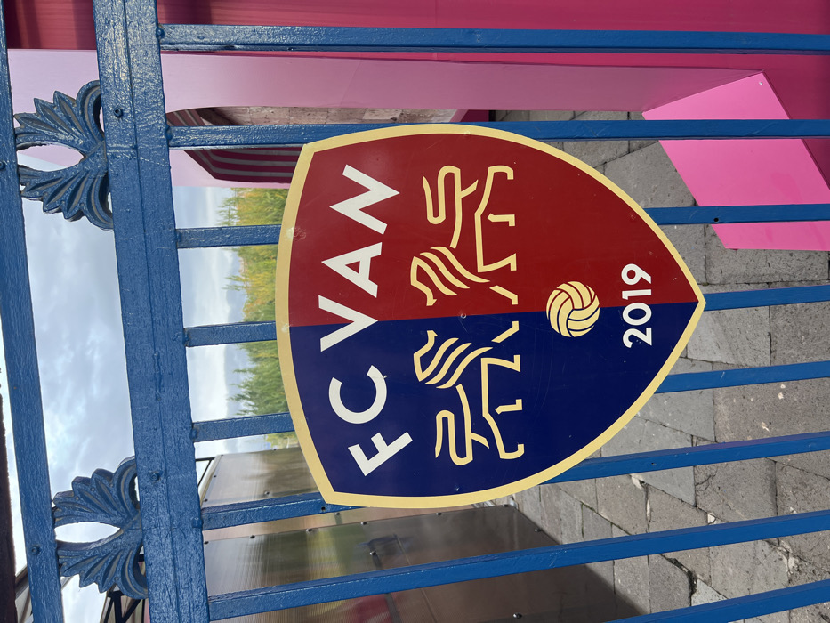 A close-up, eye-level photograph captures a shield-shaped FC Van football club emblem affixed to a blue metal gate