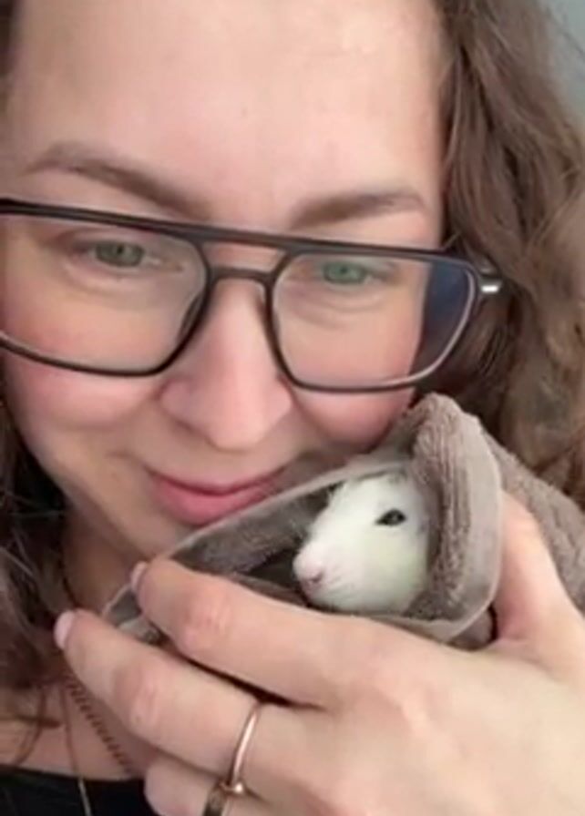 A woman with light skin, green eyes, and brown, curly hair is holding a small, white animal wrapped in a gray towel. She is wearing black-rimmed glasses, a gold necklace, and rings on her right hand. The animal appears to be sleeping or resting comfortably in her hands, with only its head visible from the towel. The woman is smiling softly and looking at the animal. The background is out of focus, suggesting a close-up shot.