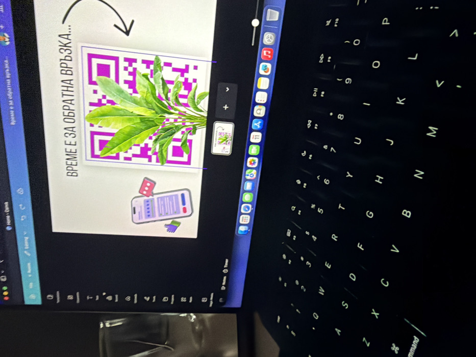 The image displays a close-up, angled view of an open laptop computer in a dimly lit indoor environment in Svilengrad, Bulgaria. The laptop's backlit keyboard, featuring standard QWERTY layout with illuminated keys, occupies the foreground. The laptop screen displays a graphic design interface, likely Canva, showing a white background with digital content. Central to the screen's display is a bright purple QR code overlaid with a green, leafy plant illustration. Above this, text in Cyrillic reads "ВРЕМЕ Е ЗА ОБРАТНА ВРЪЗКА..." (translating to "IT'S TIME FOR FEEDBACK..."), with a curved black arrow pointing towards the QR code. To the left of the QR code, an illustration of a smartphone displaying a feedback form, chat bubbles, and a "thumbs up" icon is visible. The macOS dock with various application icons is visible along the bottom edge of the screen. A blurred, reflective object, possibly a glass or part of a monitor, is partially visible on the left side of the frame. No individuals are present in the scene.