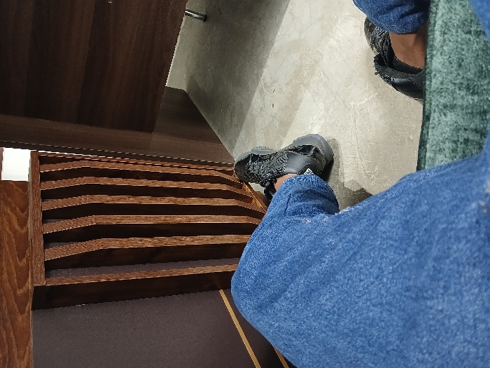 person's legs, wearing blue jeans and black shoes, sitting on a green cushioned chair. The person's left foot is resting on a brown wooden structure with vertical slats. The right foot is visible under the green cushion. The scene is likely set in an office or a workspace, given the wooden furniture and the overall environment. The location, based on the coordinates provided, is in Nairobi, Kenya.