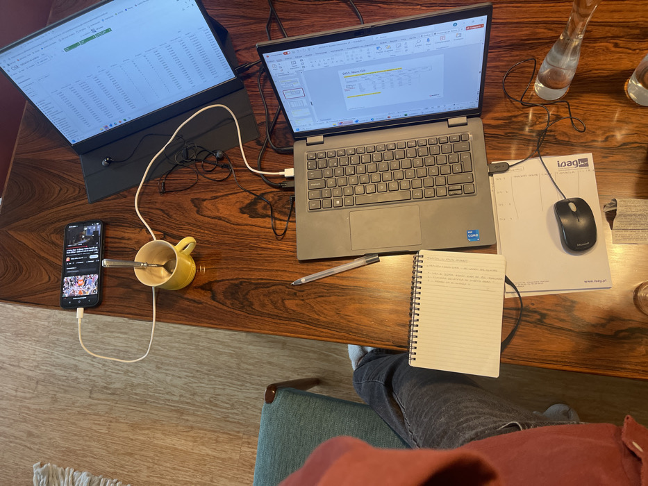 A dark wooden table hosts work-related items. A laptop displays a PowerPoint presentation, next to it a notebook with handwritten notes, a pen, and a mouse on top of some papers. To the left, a smartphone rests in a mug with a spoon holding it in place, playing a video. A second monitor is connected to the laptop. A person is sitting at the table with the notebook resting on their leg. Two water carafes stand on the right side of the table.