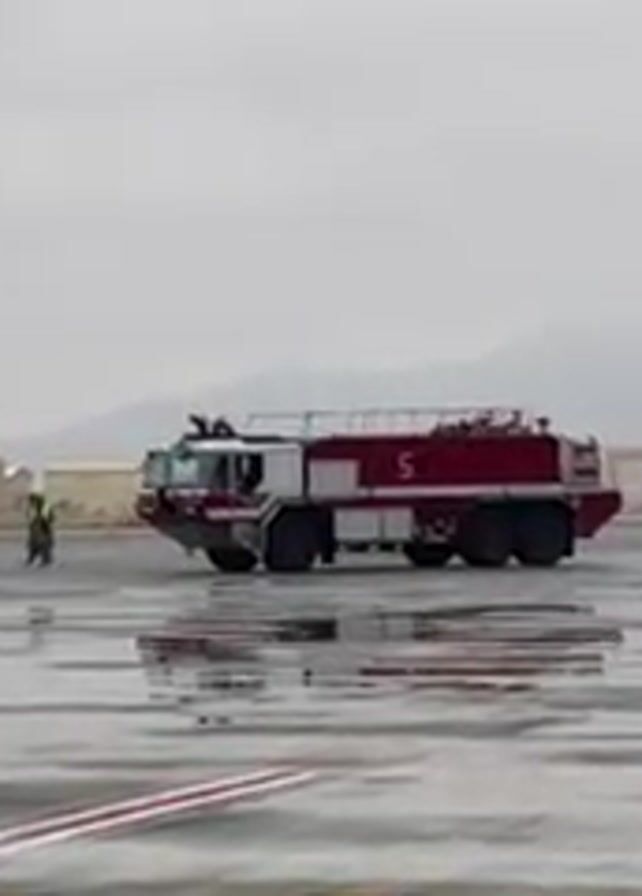 A wet airport tarmac scene shows a red and white airport fire truck labeled "5" moving towards the right side of the frame