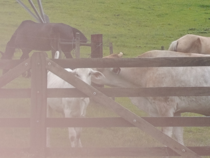 This image captures a rural pasture scene in Iperó, Brazil. A wooden five-rail fence, reddish-brown in color, extends across the midground. Behind this fence, on the left, a light-colored bovine, likely a calf, stands facing the viewer. To its right, a larger light-colored bovine faces laterally towards the right, with its head turned towards the left, appearing to lick the head/neck area of another partially visible light-colored bovine. In the background, behind a wire fence with wooden posts, a dark-colored horse grazes with its head down on the left. To the far right, the rear body of a light-colored horse is visible. The ground is a green, grassy field. A tall, multi-pronged metallic structure, possibly part of a power transmission tower, is visible in the far background above the dark horse. The scene is slightly hazy, particularly in the lower left quadrant.