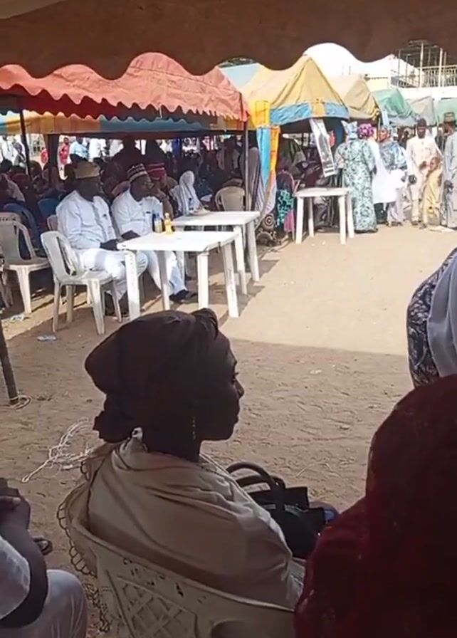 n outdoor event under a tent, with multiple people seated. Several individuals in traditional attire are walking by. Tables and chairs are set up for guests. The ground is sandy. A woman in a headscarf sits in the foreground, partially obscuring the view. Another person beside her is wearing a red and brown patterned garment. The camera slowly pans, showing a wider view of the gathering.