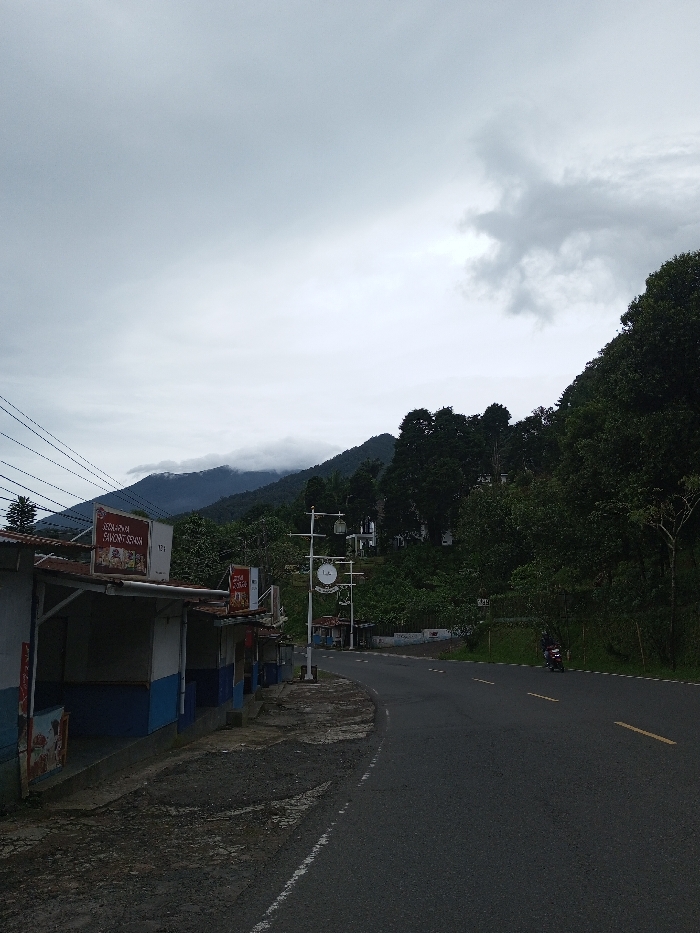 This image depicts a mountainous roadside scene. The foreground features an asphalt road curving gently uphill to the right, marked with a continuous white line on the left shoulder and double yellow lines centrally. To the left of the road, a row of three simple, single-story vendor stalls or small buildings with corrugated metal roofs and white and blue painted walls are visible. A prominent sign on the leftmost structure displays text in Indonesian, "SEDIA KOPI SACHETAN" (instant coffee sachets available), alongside other illegible text. Power lines are strung overhead on the left. Further along the road on the left, a decorative white street lamp post with multiple arms and a central circular emblem or clock is positioned. No people are present. In the midground, a dark-colored motorcycle is visible on the right side of the road, adjacent to a steep, densely vegetated slope. The background is dominated by large, tree-covered mountains, their upper sections partially obscured by low-lying clouds or mist. The sky is heavily overcast with a uniform grey cloud cover. While requested as Adhanur, India, the visible Indonesian signage contradicts this geographical attribution.