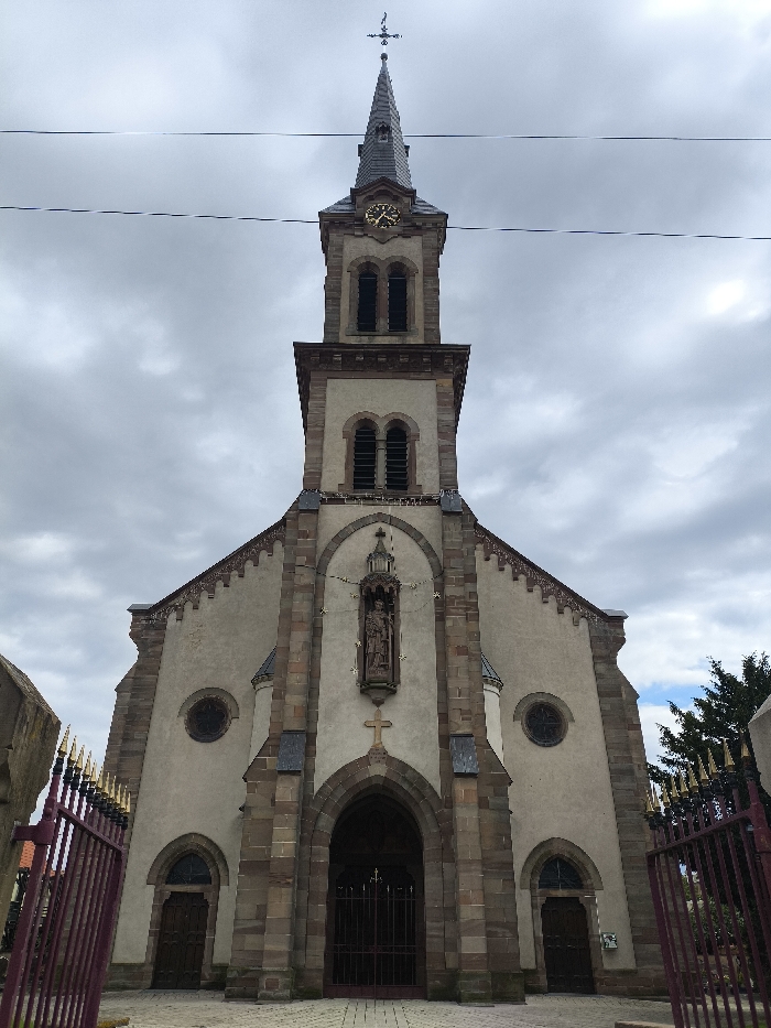 This is a low-angle, front-facing photographic documentation of Église Saint-Laurent (Saint Lawrence Church) located in Holtzheim, France