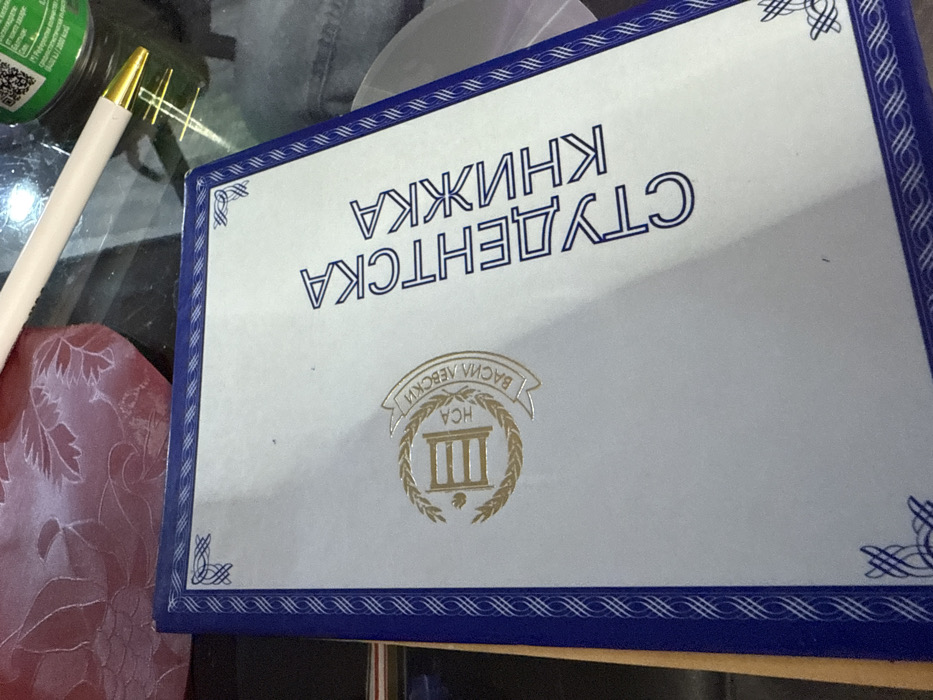- "A white student's record book with a blue decorative border and a gold emblem is positioned on a reflective dark surface" by FM-6fkMy1, licensed under CC BY 4.0