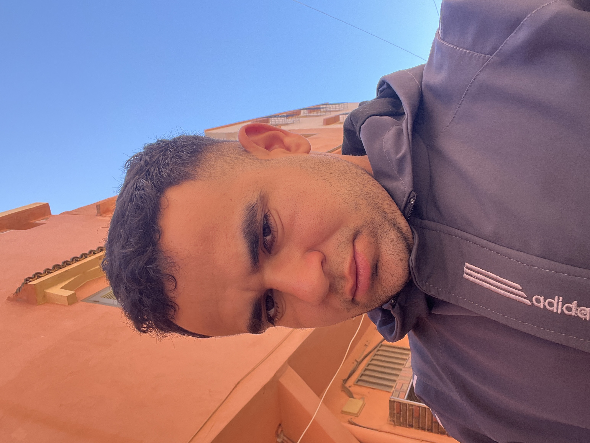 A man poses close to the camera with a building and clear blue sky as a backdrop. He wears a hooded Adidas jacket, a neutral gray color. His hair is short and dark, and his expression is neutral. The building, a vibrant terracotta color, features geometric elements, and is situated behind the man. The photo appears to have been taken outdoors in the city of Ouaouizert, Morocco.