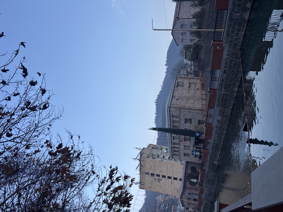 The image displays an urban landscape in Kapan, Armenia, under a clear, light blue sky. In the upper left quadrant, dark, predominantly bare tree branches with a scattering of dark brown, withered leaves are visible. A body of water, possibly a river or canal, occupies the lower third of the frame, exhibiting reflections of the adjacent bank and sky. A dark-colored railing is partially visible in the extreme lower left foreground, bordering the water. A dark, angular object is partially submerged in the water on the right side. The left bank of the water features a stone retaining wall topped by a fence comprising dark metal vertical bars and brown horizontal panels. Behind this fence, a prominent two-story building with a light brown stone facade and multiple rectangular windows is situated. A tall, slender evergreen tree stands directly in front of this building. An Armenian flag, displaying vertical red, blue, and orange stripes, is visible on a flagpole near the building's entrance, accompanied by two blue square pedestrian crossing signs with white symbols mounted on poles. To the immediate left of this building, a smaller, similarly constructed stone building with an arched entrance is partially visible. Further back and to the left, a tall, multi-story, light-colored concrete building with numerous windows and rooftop antenna structures rises prominently. On the right bank of the water, another stone building, architecturally consistent with the main building on the left bank, is visible. A tall, slender street light pole with a modern fixture stands on the right side. The background is dominated by rolling hills or mountains, sparsely covered with dark green and brown vegetation, extending behind the urban structures. Scattered residential buildings are discernible on the slopes of the mountains on the far left.
