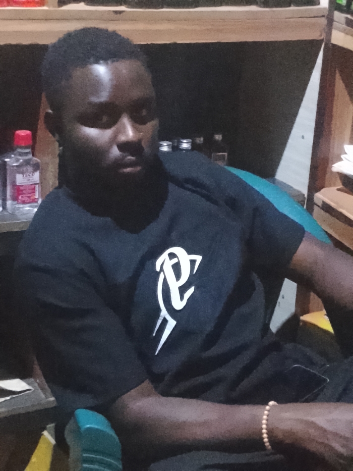 A dark-skinned man sits in a green chair wearing a black t-shirt with a white logo. He has short, dark hair and appears to be resting. A simple beaded bracelet adorns his right wrist. Behind him is a wooden structure, possibly shelving, containing various bottles and containers. A white bottle with a red cap is visible on the left side of the frame. The lighting is dim, casting shadows across the scene.