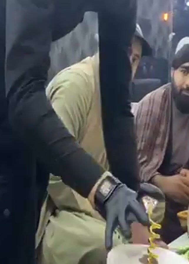 A low-angle shot captures a scene inside a restaurant. Several men are seated around a table laden with food and drinks. A person wearing black gloves reaches across the table, seemingly attending to the food, which includes a round platter with what appears to be roasted meat and vegetables. Two men are clearly visible at the table. One wears a traditional white cap, a brown shawl, and has a beard. The other man sits beside him. The restaurant setting includes stainless steel furniture and a decorative backdrop. Overall, the scene suggests a social gathering or meal taking place.