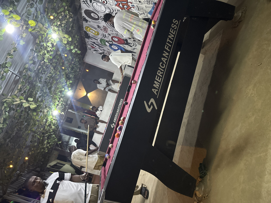 A group of people are enjoying a game of pool in an outdoor setting. A man in a white and black striped shirt is focused on making his shot. The pool table, branded "American Fitness," dominates the foreground. Overhead, leafy foliage adorned with small lights creates a festive ambiance. Graffiti art decorates the wall behind the players, adding a splash of color to the scene.