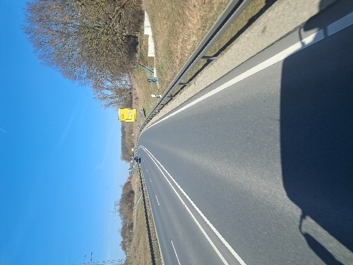 - "The image displays an asphalt two-lane highway under a clear blue sky, observed from a vehicle's perspective, indicated by a dark shadow cast across the foreground pavement" by FM-4Odc12, licensed under CC BY 4.0