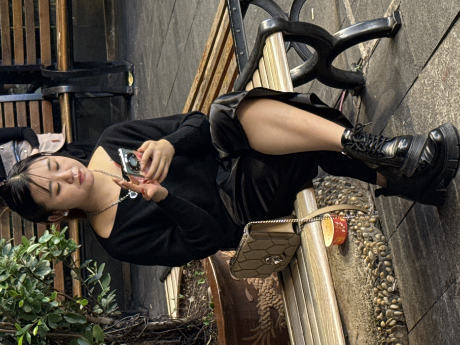 - "A young East Asian female is seated on a wooden and dark metal park bench in an urban environment within Yuzhong District, China" by FM-LQg7b2, licensed under CC BY 4.0