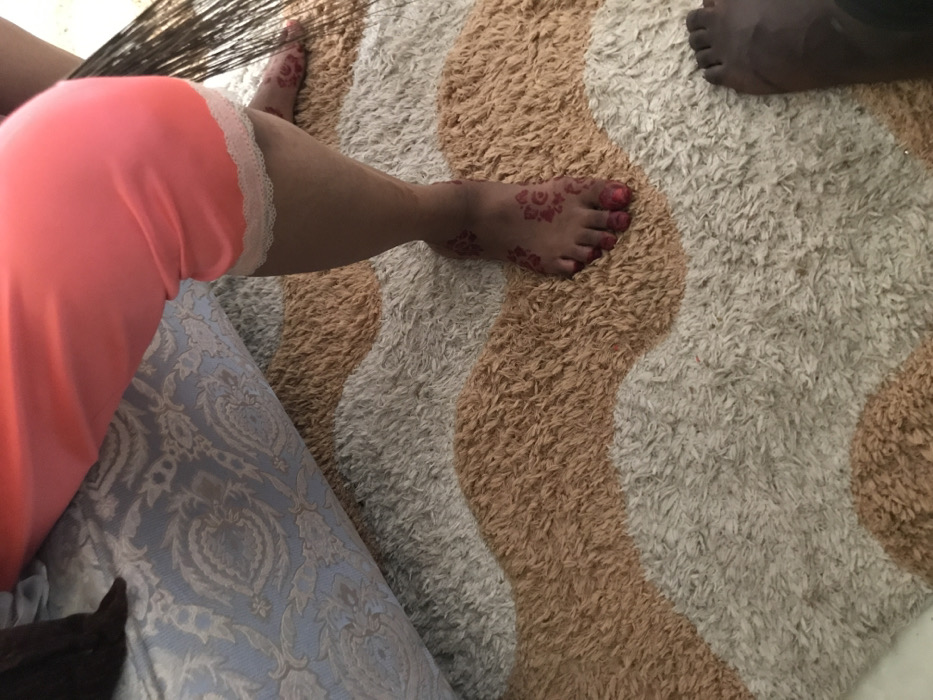 The scene depicts an indoor residential setting in Unknown, Unknown, viewed from an overhead perspective. The image focuses on the lower extremities of two individuals and a patterned rug. One individual, with medium brown skin, is partially visible in the upper left and center. This person wears bright coral-pink capri-length pants with a white lace trim. Their left leg is bent, with the foot resting on a shaggy area rug. Both visible feet belonging to this individual display intricate red henna patterns and red nail polish on the toenails. A dark brown fabric object is partially visible near the upper left thigh area of this individual. A second individual is represented by a single dark-skinned bare foot visible in the bottom right corner, resting on the same rug. The floor is predominantly covered by a shaggy area rug featuring a wavy, abstract pattern in shades of light brown, beige, and off-white. To the upper left, a piece of light blue furniture, likely a couch or bed, with an intricate white and light gray paisley-like pattern is visible. Along the right edge of the frame, a bundle of thin, dark brown bristles, consistent with a broom or brush, is partially visible. The scene is static.